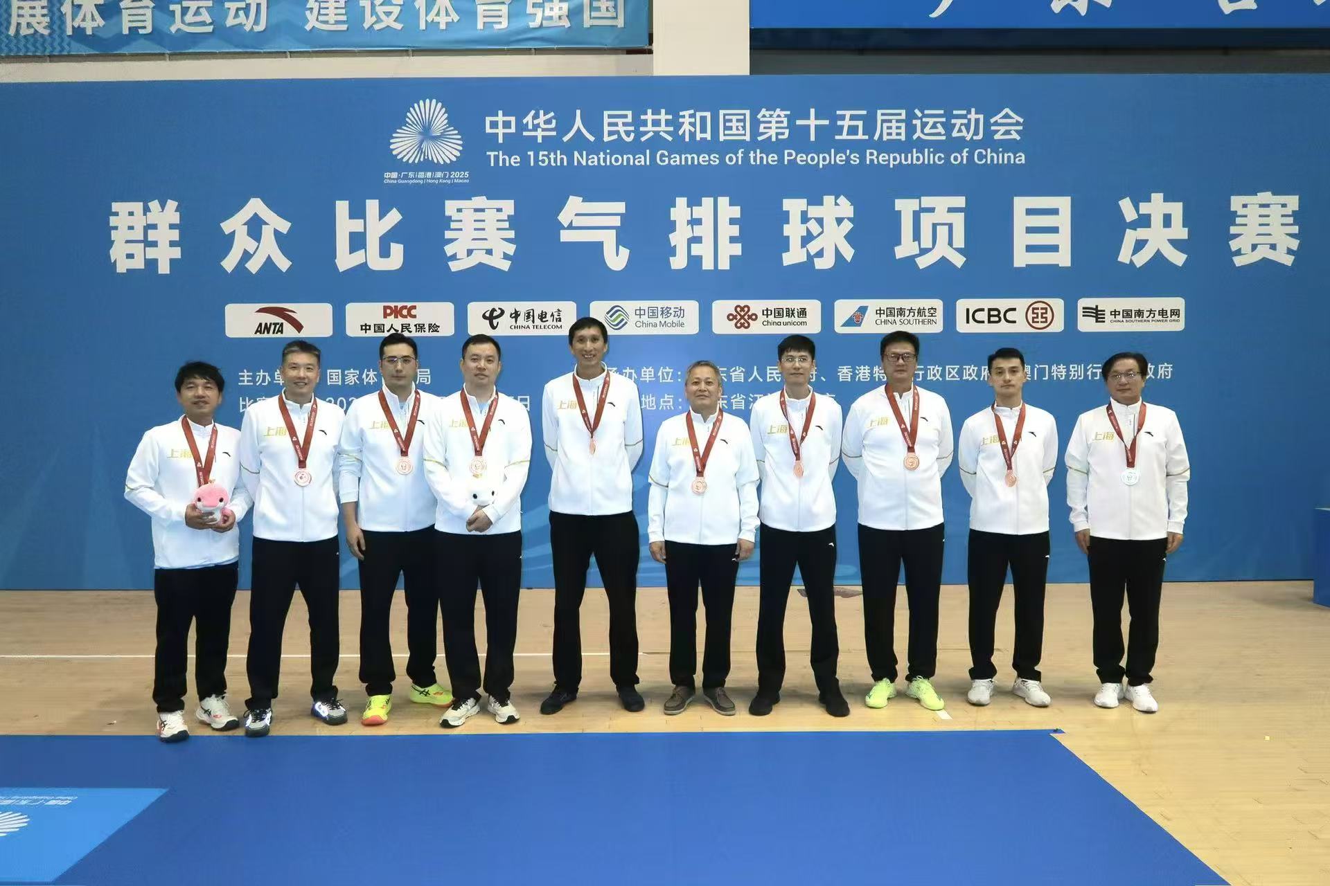 2025年8月21日至25日,中华人民共和国第十五届运动会群众比赛气排球项目决赛在广东台山举行。本次气排球项目比赛设置男子青年组、女子青年组、男子中年组、女子中年组、男子老将组、女子老将组、男女混合组七个组别。在此前进行的资格赛中,上海市代表队共有女子老将组、男子老将组、女子中年组三个小项进入决赛。其中公司伟德bv国际体育官方网站教师任建代表上海队在男子老将组决赛中获铜牌,取得上海市气排球项目代表队的最好成绩。