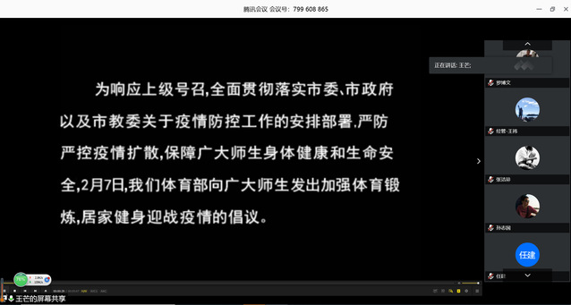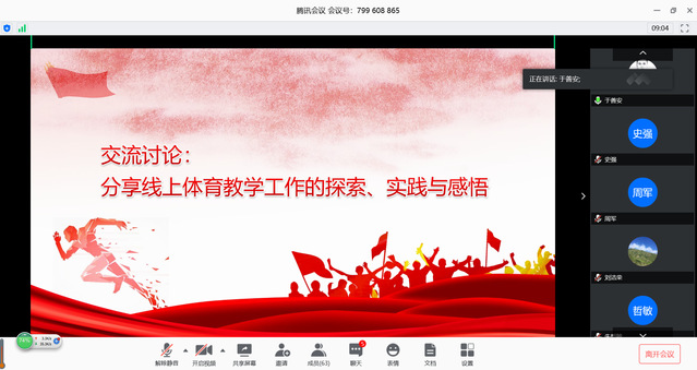 第三环节为支部党员交流分享线上体育教学工作的探索、实践与感悟。五名党员教师代表结合各自教学专项,总结分享了近期开展线上教学中的经验、思考和体会。大家互学互鉴,相互学习,共同提升,进一步推动接下来线上教学工作的有效开展。交流环节中播放了体育教师线上教学和员工居家锻炼情况的短视频,生动展现了师生全面落实“停课不停教、停课不停学”的有益实践,使参会人员深受感动。体育部常务副主任于善安全面总结了体育课在线教学整体开展情况及思考,并对下一阶段线上教学进行了整体规划,号召大家共同努力,圆满完成体育课线上教学任务。